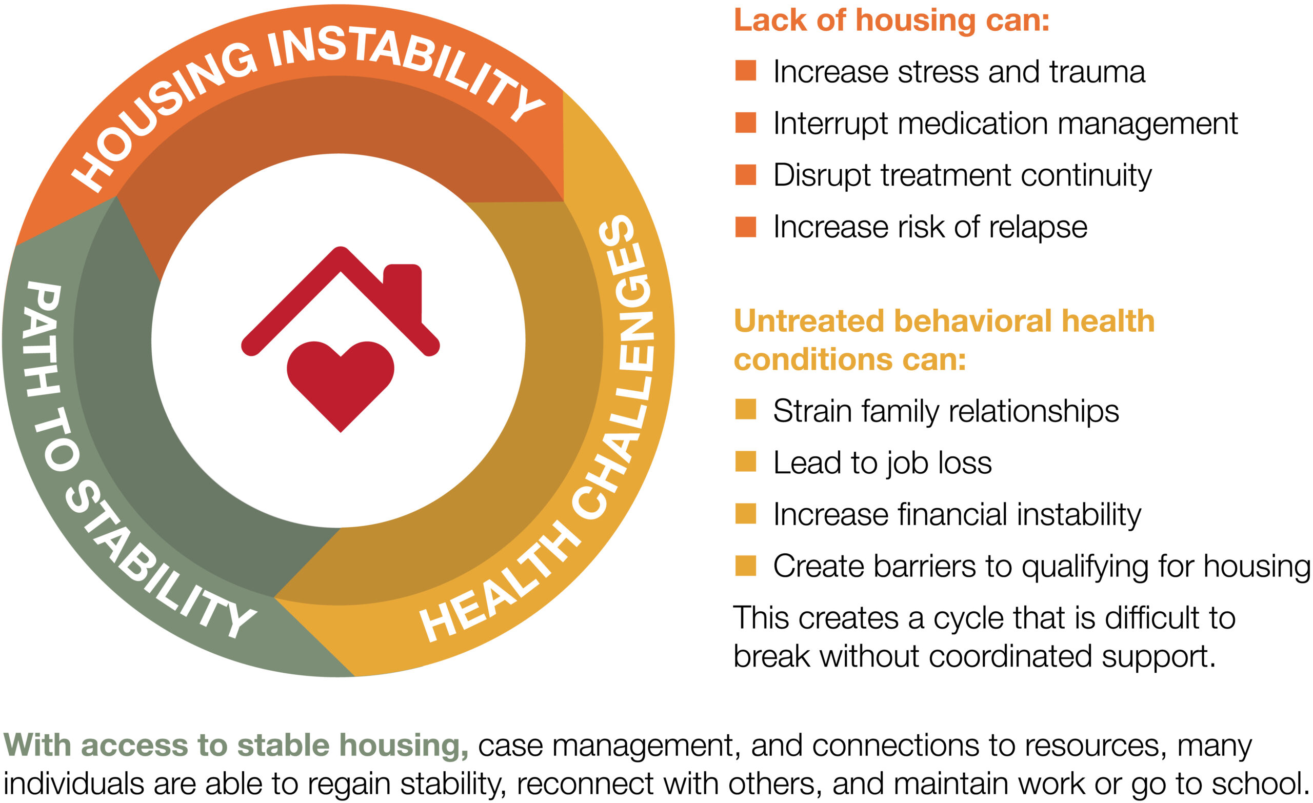 Mental health conditions and substance use disorders can contribute to housing instability and be worsened by it.